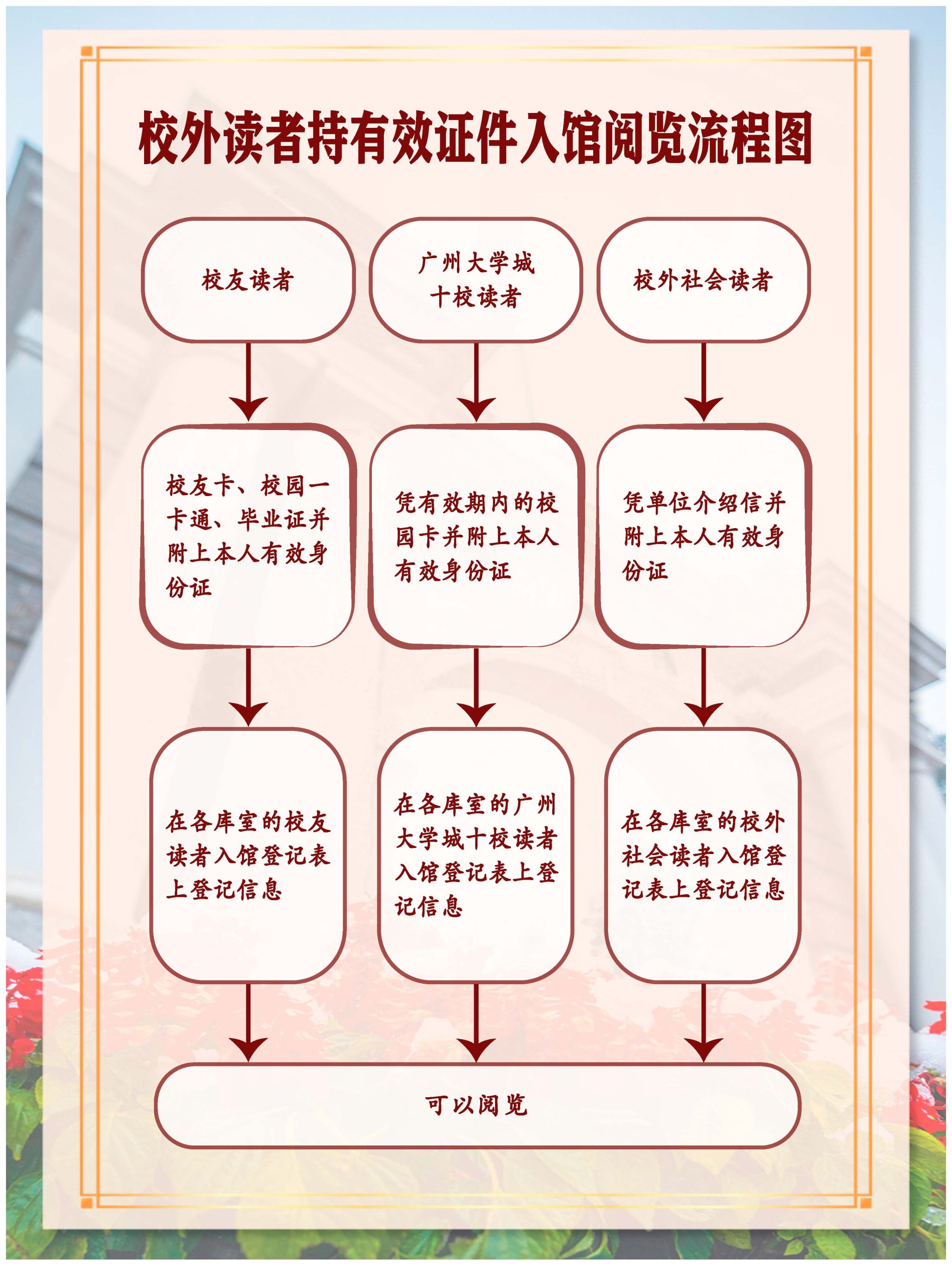 2.广州大学城十校读者可凭有效期内的校园卡+身份证等进馆阅览。