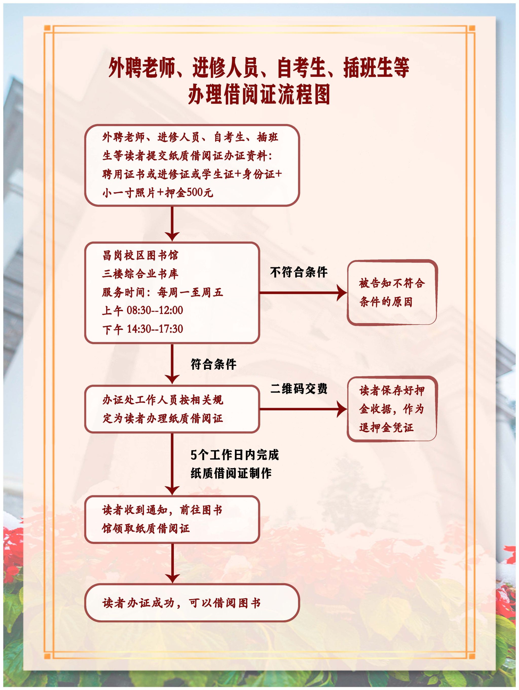 3.本校外聘教师、进修人员、自考生、插班生等读者,凭聘用证明或进修证或学生证+本人有效身份证等有效证件即可入馆阅览图书;外借图书则须办理纸质借阅证,凭有效证件(聘用证明或学生证+身份证等)交小一寸照片和押金500元办理,押金在离校时归还所借图书后全额退还。