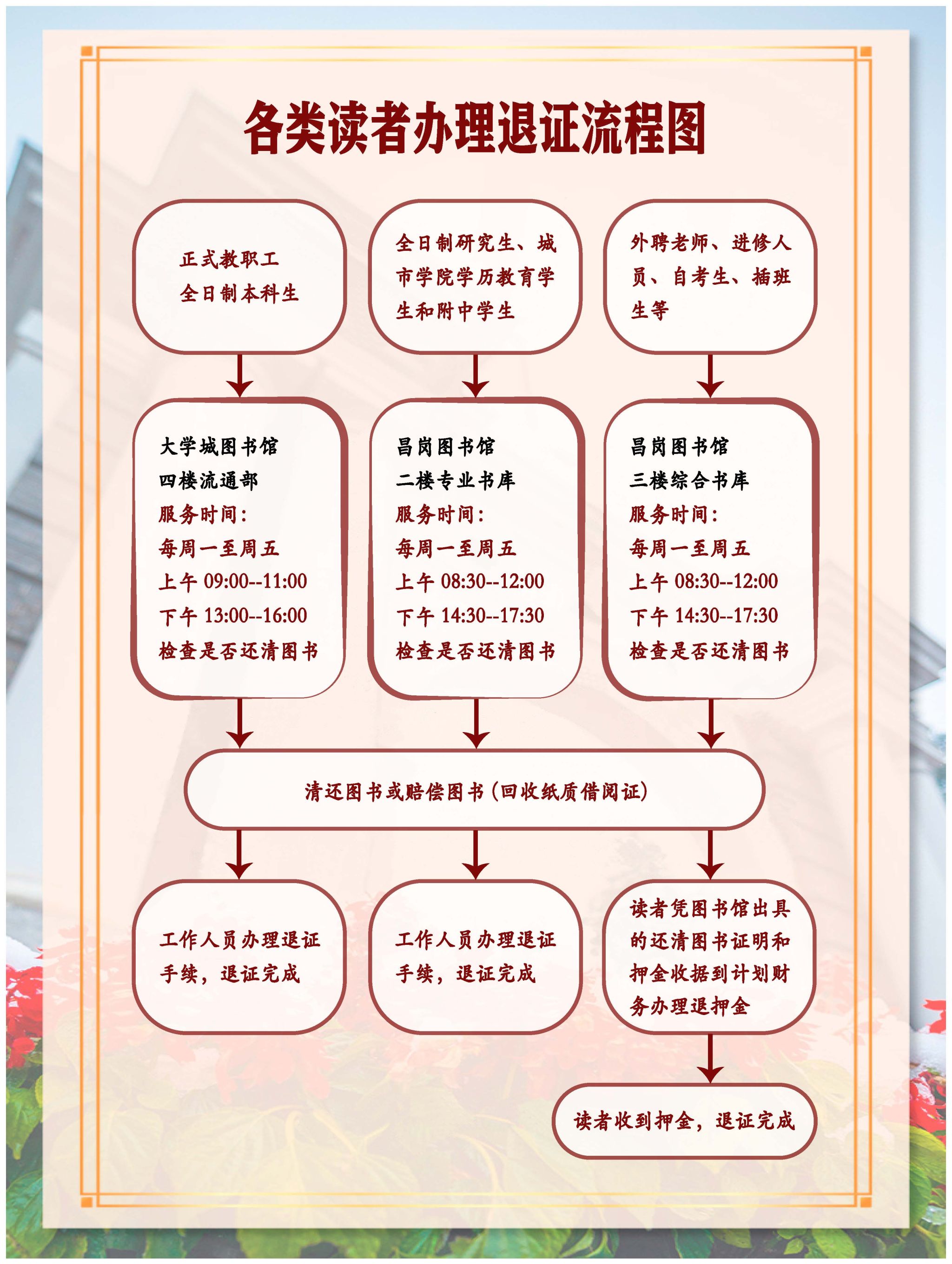 1.本校读者因毕业、工作调动、退学、出国、肄业、进修结业等原因离开学校时,须将所借图书馆的文献资料全部还清,并办理借阅证退证手续,方可办理离校手续。借阅证所有者去世后,其原有借阅证自动失效,其他人不得继续使用。