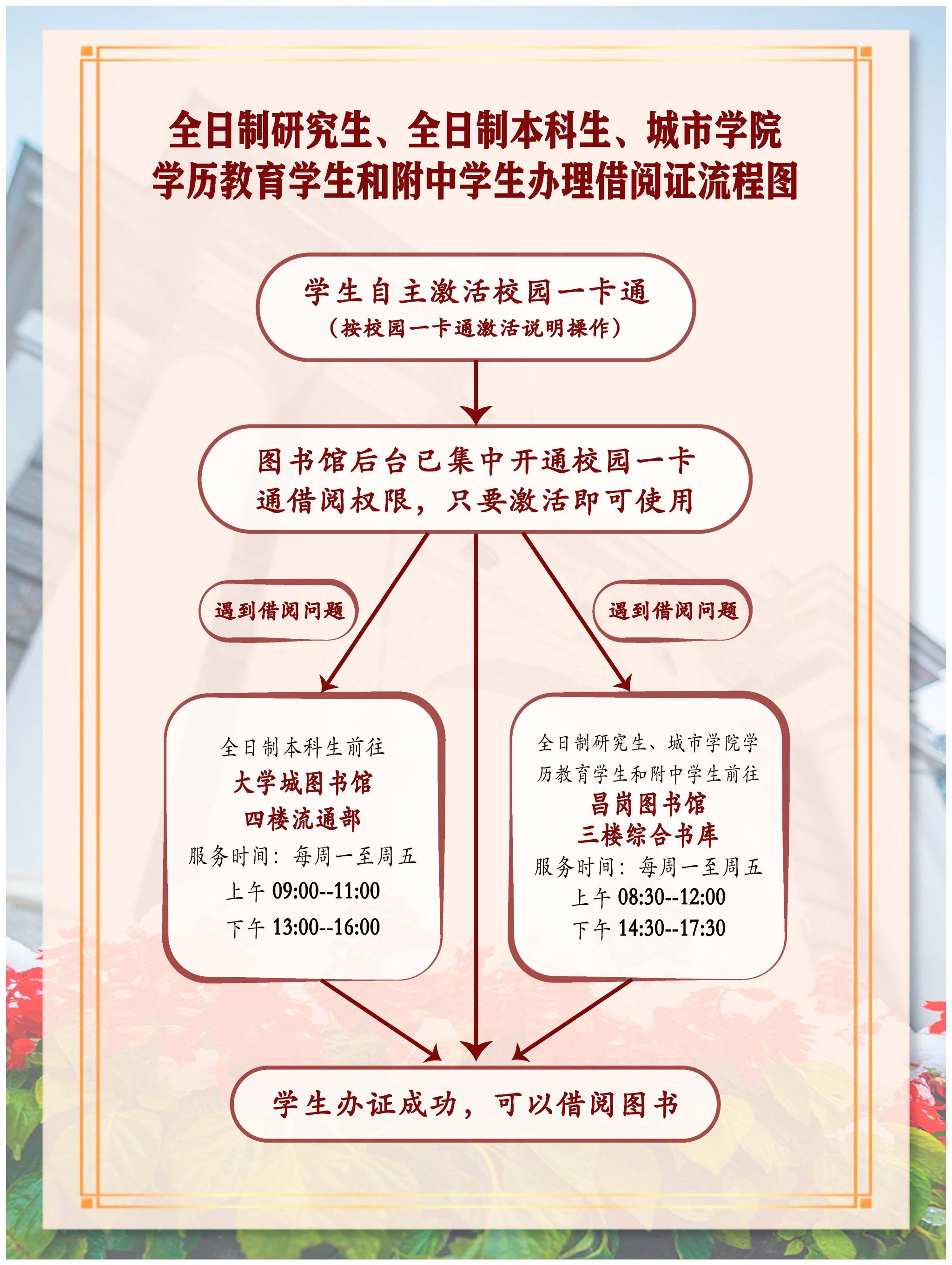2.本校研究生、全日制本科生、成人高等教育学历教育学生和附中学生的校园一卡通,先由图书馆依据学校财务处提供的学生校园一卡通名单,在图书馆管理系统为学生批量集体开通一卡通的借阅权限,学生只要自主激活校园一卡通即可借阅图书。